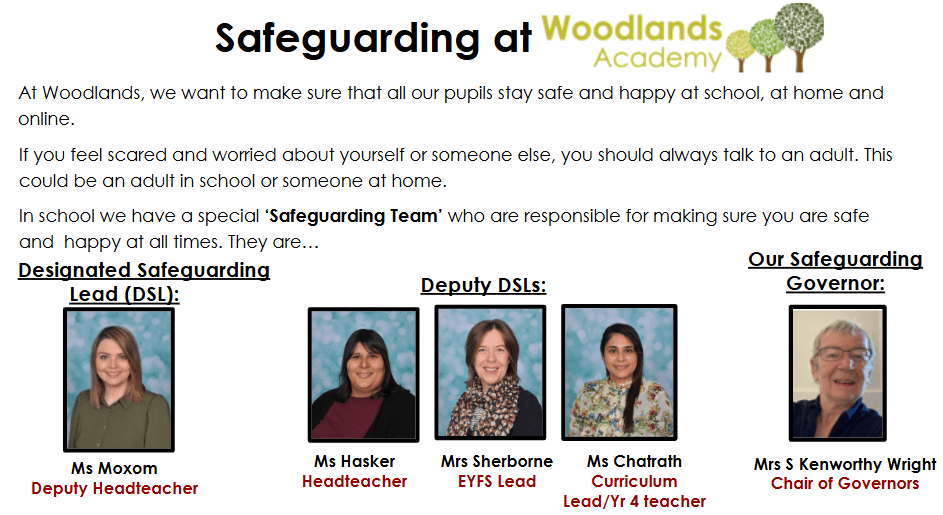 In our school, our Safeguarding Team is led by Ms Moxom (Assistant Headteacher) who is our Designated Safeguarding Lead (DSL). She is supported by Ms Hasker (Headteacher) and Ms Sherborne (EYFS lead). We keep up to date with Safeguarding news and communicate relevant content with parents in our ‘Safeguarding Spotlight’ section in our fortnightly Woodlands Bulletin. You can access the Woodlands Bulletins here.