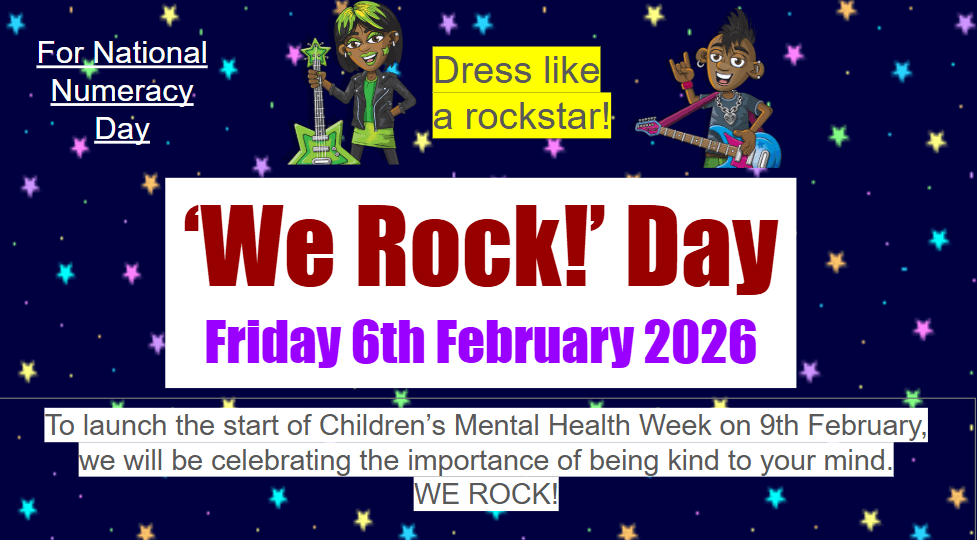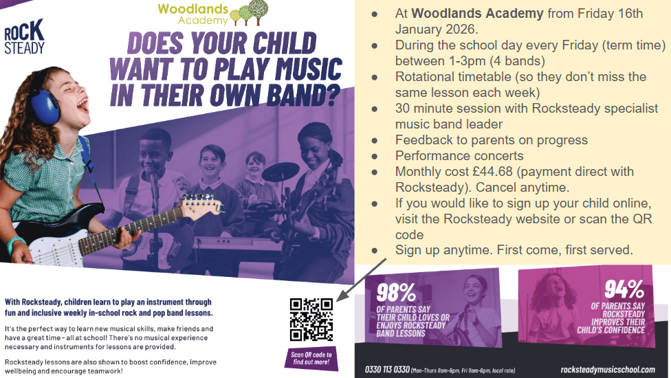 - Rocksteady band sessions – every Friday 1-3pm (30 minute band sessions).See poster below for details. To sign your child up, visit rocksteadymusicschool.com